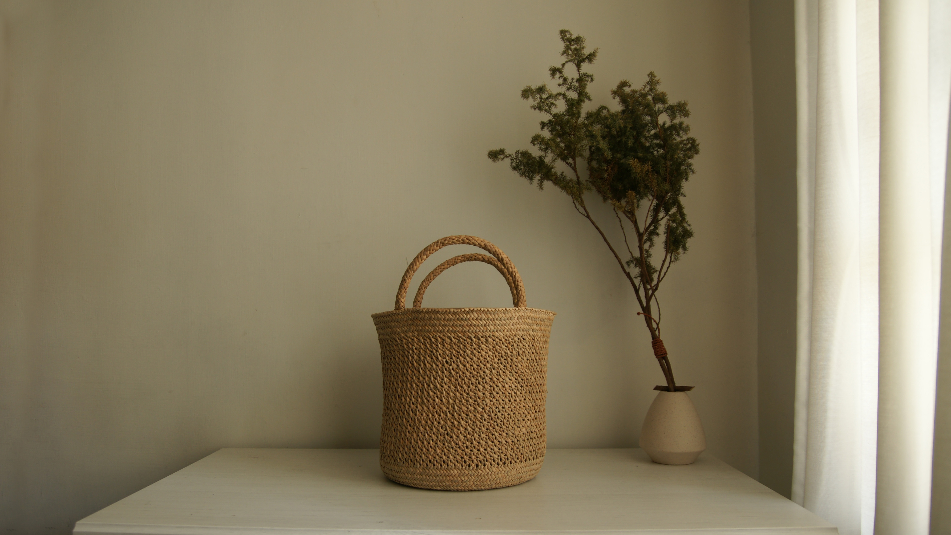 ▲ 保留藺草最原始的質地,運用在地百年的藺編技法,包身微微鏤空的花紋與藺草立體的紋路,節奏規律地相接交錯,搭配圓柱形的提把,共譜藺編獨有的温柔樂章。