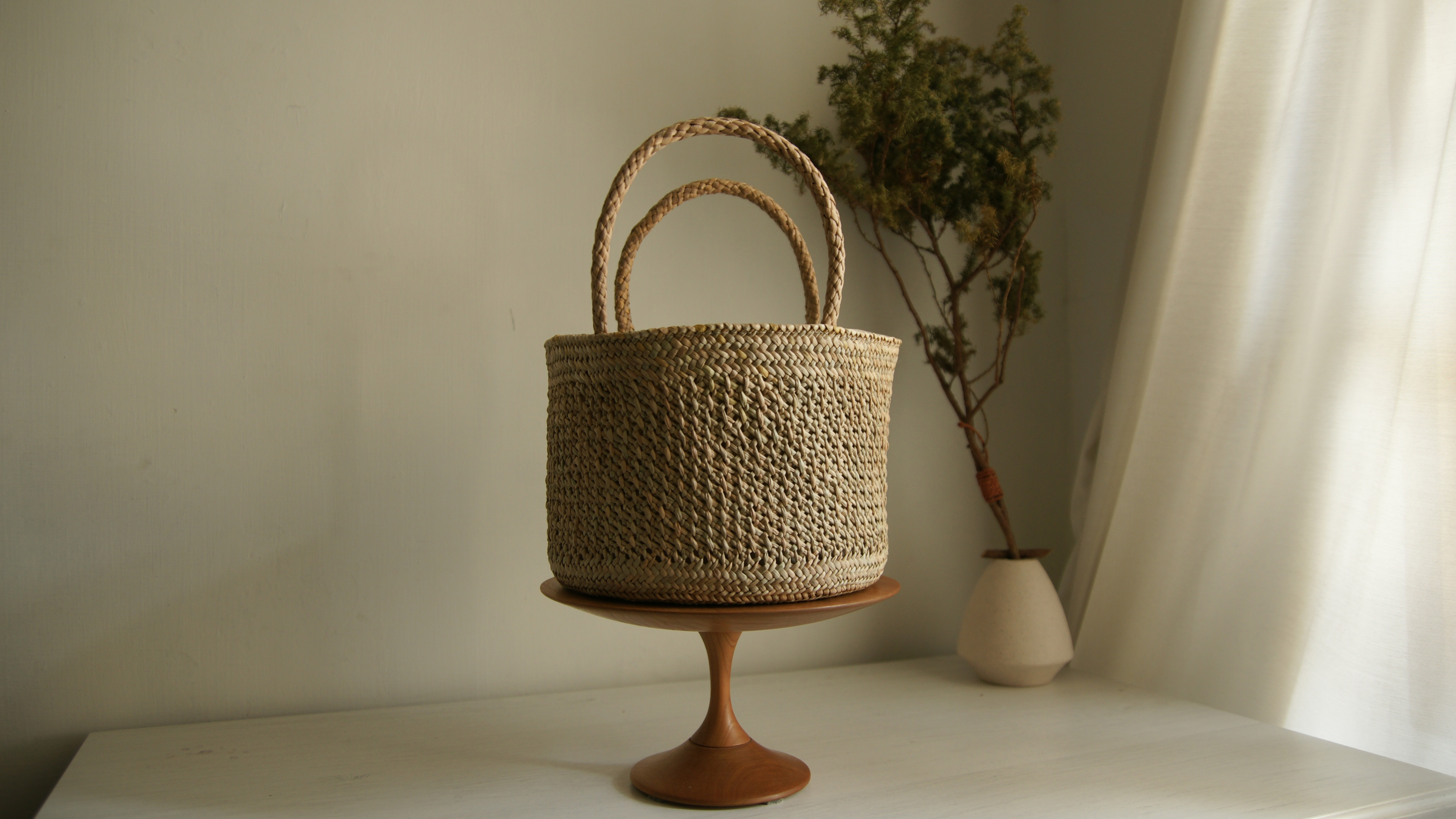 ▲ 保留藺草最原始的質地,運用在地百年的藺編技法,包身微微鏤空的花紋與藺草立體的紋路,節奏規律地相接交錯,搭配圓柱形的提把,共譜藺編獨有的温柔樂章。